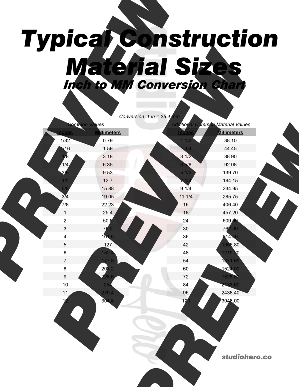 High resolution .PDF file to aid in converting Inches and Millimeters for common construction sizes (.PDF, 1 Page at 8.5" x 11").