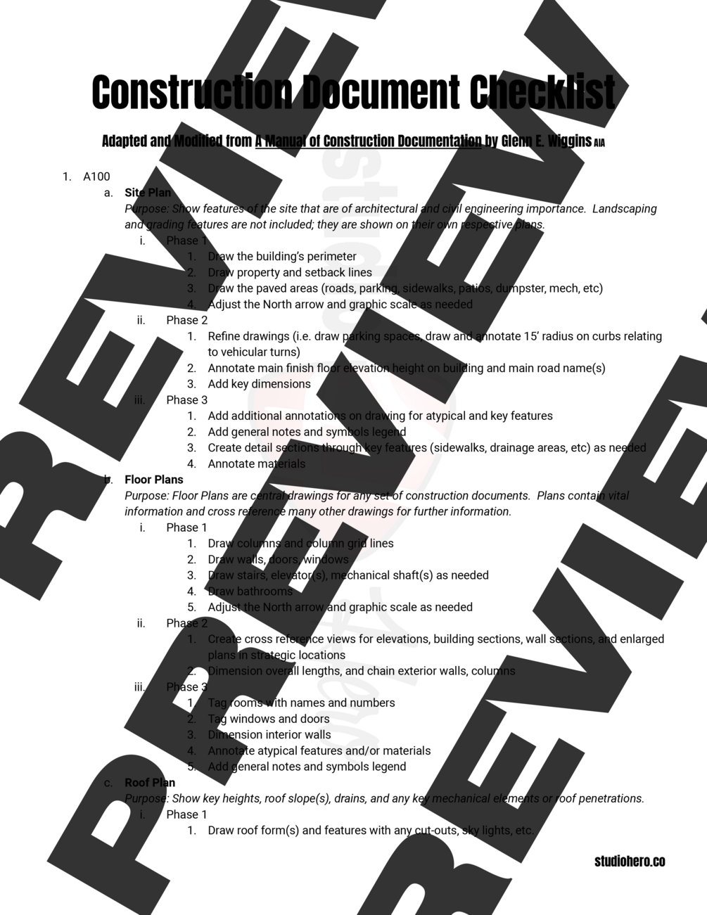 High resolution .PDF file to aid in creating Construction Documents consistently in a phase-by-phase manner (.PDF, 8.5" x 11").